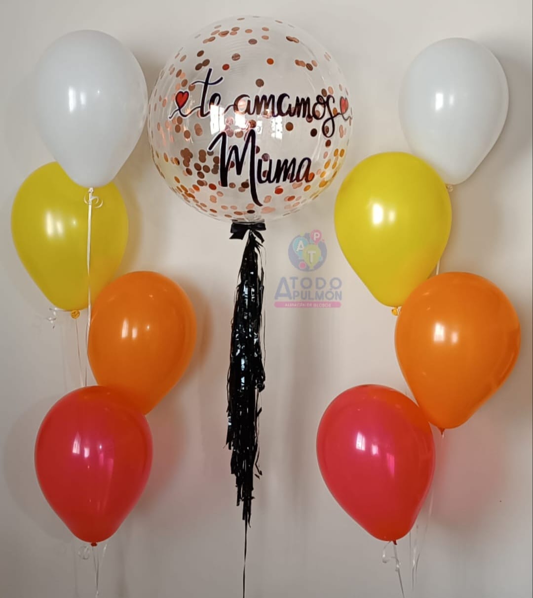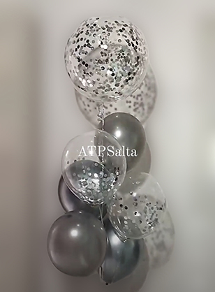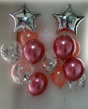 Bouquet compuesto por Globo Metalizados formas 18' Látex 12' común, decorado y chrome. Colores a elección.