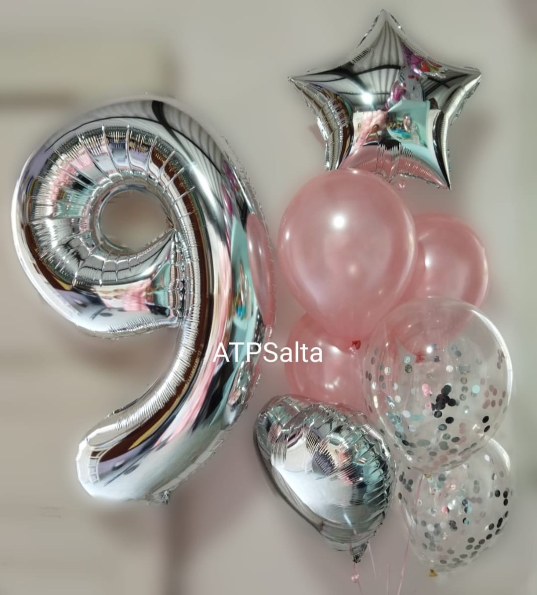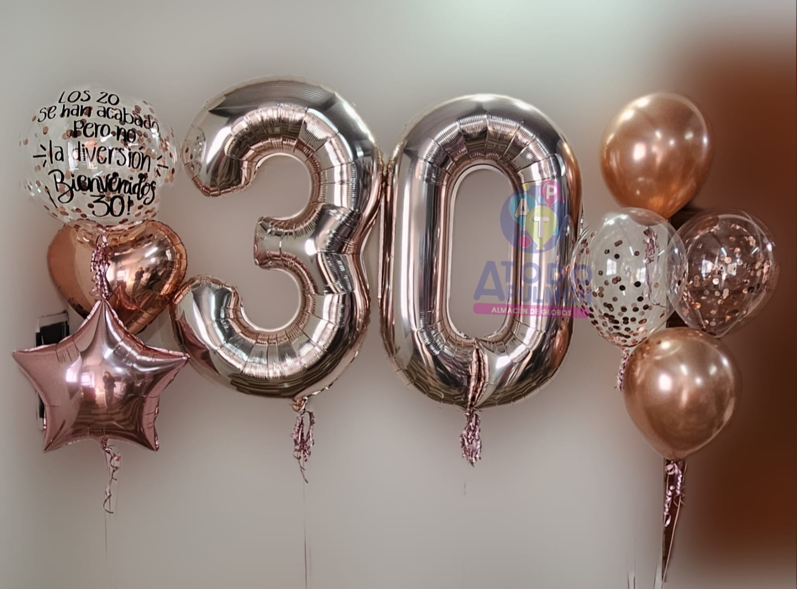 Imponente decoración con helio. Globos N° metalizado de 1 metro, globo burbuja personalizada, globos metalizados 18', globos de látex 12' Chrome y con confeti. Todo personalizado.