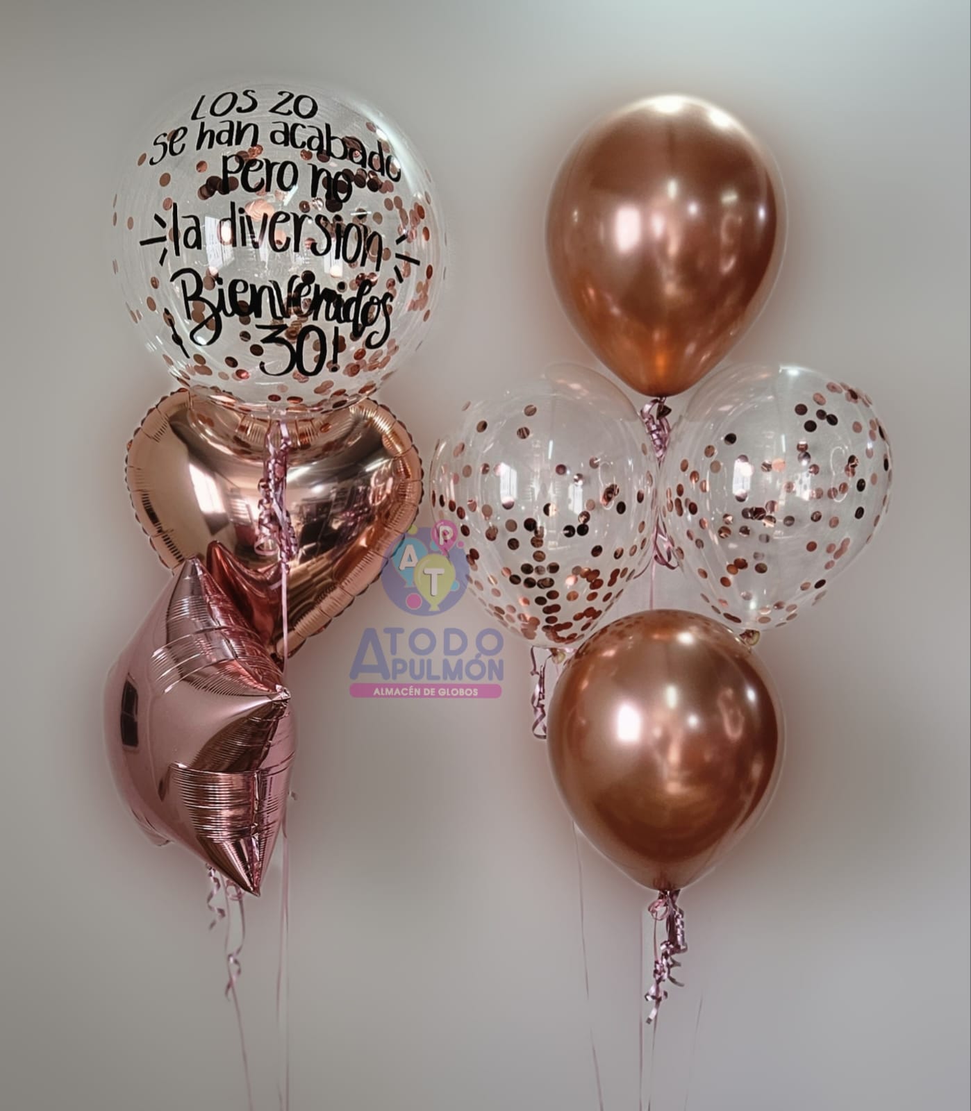 Globos esferas de 22' y globo burbuja con confeti. Colores, dorado, plata y rosa gold.